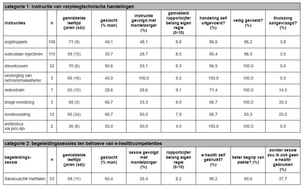 In totaal hebben 335 deelnemers een vragenlijst ter evaluatie van de activiteiten volledig ingevuld. Gemiddeld scoren zij het belang van het zelf regie kunnen voeren over hun zorg een 8,51 op een tienpuntsschaal. Dertien van de 282 deelnemers aan trainingen uit categorie 1 hebben nog thuiszorg aangevraagd (5%). Het overgrote deel van de deelnemers aan activiteiten uit categorie 1 en 2 heeft de handeling zelfstandig uitgevoerd (88%) en heeft zich voldoende veilig gevoeld (97%). Op twee deelnemers na is elke deelnemer de e-healthapplicatie gaan gebruiken. Het overgrote deel geeft aan de ziekte beter te begrijpen (n = 48).