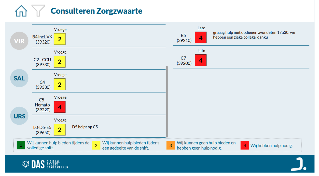 “GM: “Elke afdeling gebruikt minstens twee keer per dag de app om te registreren en daarbuiten de zorgmanagers. Degene die van wacht is gaat er ook regelmatig naar kijken. De vorige week ben ik gaan kijken hoe vaak het gebruikt is en daaruit blijkt dat die een kleine 900 keer per week gebruikt werd door de medewerkers die de zorgzwaarte registreren; door medewerkers die gaan kijken of ze hulp kunnen bieden en ook door zorgmanagers die de informatie over hun afdelingen volgen. Ook de medewerkers van de mobiele equipe wijzen op basis van die gegevens hulp toe aan de afdelingen die dat nodig hebben. Dus ja, we hebben effectief 900 keer per week kliks op de app, met een uitschieter van bijna 130 op een dag.”