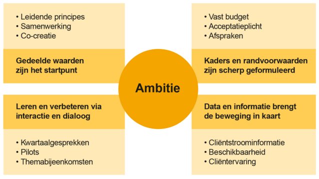 Voor ons is partnerschap met gecontracteerde partijen en belangrijke stakeholders (zoals organisaties in het medisch domein en de langdurige zorg) een belangrijke randvoorwaarde om het steeds beter te doen met en voor inwoners. De opgaven in het sociaal domein zijn complex, kennen onderlinge afhankelijkheden en brengen afbreukrisico’s met zich mee. Dergelijke opgaven aanpakken en ermee verder komen vergen eigenaarschap en lef. Ze vragen ook om een relatie waarin ruimte is om samen lijnen uit te denken vanuit een gedeelde visie, in gesprek te gaan over dilemma’s en knelpunten en vertrouwen in elkaar te ervaren. - We werken in co-creatie en leren en ontwikkelen stapsgewijs.