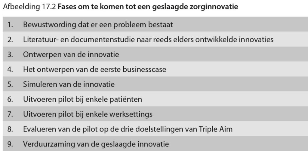 n de vijfde fase is sprake van simulatie van de innovatie, die dan al is ontworpen in termen van stroomschema’s en verdelingen van verantwoordelijkheden, bevoegdheden en activiteiten. Het simuleren kan gebeuren in bijeenkomsten aan de hand van een casus waarin de oude en de nieuwe situatie worden vergeleken. Op deze manier is ook een risico-inventarisatie vooraf te doen. Dit is een van de pijlers van het veiligheidsmanagement-systeem. Veel ziekenhuizen passen deze prospectieve risico-inventarisatie toe bij innovaties zoals het ontwerpen van zorgpaden. Geavanceerder is het werken met serious gaming en met system dynamic modelling. Deze laatste is vooral interessant bij keteninnovaties, maar vereist wel de aanwezigheid van een gezamenlijke database van het bestaande zorgaanbod van de gehele keten.