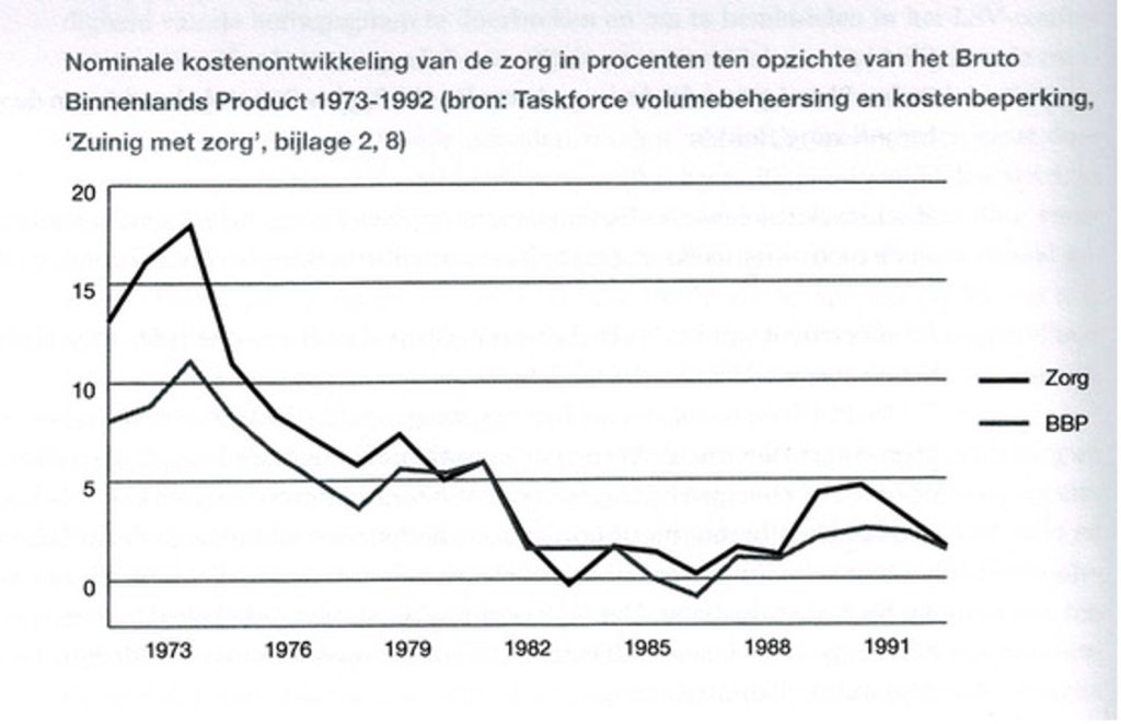 Het kostenbeheersingsbeleid van de overheid was in het verleden in staat om de reële groei van de zorguitgaven te dwingen tot een gezonde verhouding met de nationale economische groei. Met woorden van deze strekking beëindigen Companje en collega’s op pagina 497 hun tweeluik over vijftig jaar kostenbeheersing in de zorg. Zij illustreren deze conclusie met onderstaande grafiek. Aan het einde van Deel I tonen zij een vergelijkbare grafiek voor de jaren 1973 – 1992.