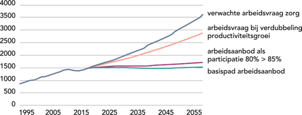 Deze grafiek laat nog duidelijker zien dan de schenkkan-afbeelding dat traditionele “beleidsrecepten” als arbeidsparticipatie en meer productiviteitsgroei (via digitalisering, eHealth) uiteraard belangrijk zijn maar – ook gezamenlijk – waarschijnlijk niet afdoende zijn. Immers, een verdubbeling van de productiviteitsgroei lijkt een weinig realistisch perspectief. Maar zelfs al zou het gerealiseerd worden, dan laat deze raming zien dat daarmee nog steeds niet volledig aan de stijgende zorgvraag voldaan kan worden.